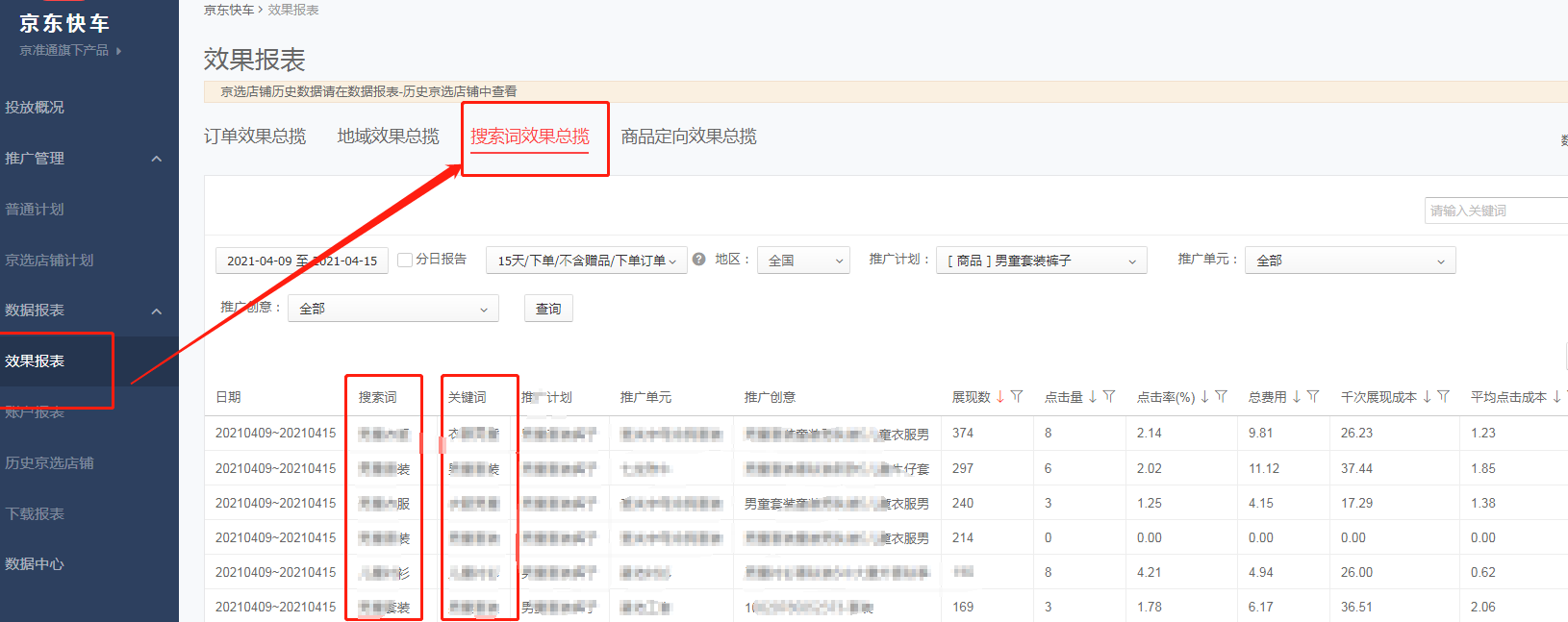 除了行業(yè)大盤里面的行業(yè)熱搜詞之外,對于已經(jīng)投放過快車和海投的商家來說,可以在效果報表里面看到搜索詞效果總覽??梢赃x擇最近七天的數(shù)據(jù),然后看七天內(nèi)數(shù)據(jù)最好的關(guān)鍵詞,從中找出有訂單的成交詞和展現(xiàn)點擊率高的引流詞加入的新計劃中進行測試。這里要注意的是搜索詞效果總覽只會統(tǒng)計最近七天的數(shù)據(jù),商家們要養(yǎng)成開啟計劃之后每七天下載一次數(shù)據(jù)報表的好習(xí)慣喲。
