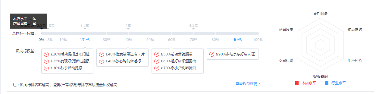 我們首先可以從店鋪星級(jí)和風(fēng)向標(biāo)的坐標(biāo)軸可以看出,風(fēng)向標(biāo)在每個(gè)不同的分?jǐn)?shù)比例上,會(huì)有不同的分?jǐn)?shù)顯示以及會(huì)帶來(lái)不同好處和壞處。在上圖可以看出每個(gè)店鋪的風(fēng)向標(biāo)基礎(chǔ)是需要在20%以上,才能去提報(bào)一些活動(dòng).(所以在我們馬上到來(lái)的618大促,能不能進(jìn)入到大促的門檻,各位同學(xué)可以去看下你夠資格參加嗎?)同樣的在店鋪排名率達(dá)到90%以上的話可以申請(qǐng)京東好店的認(rèn)證,有了好店的認(rèn)證對(duì)于店鋪的權(quán)重和流量都會(huì)有很好的增長(zhǎng)。