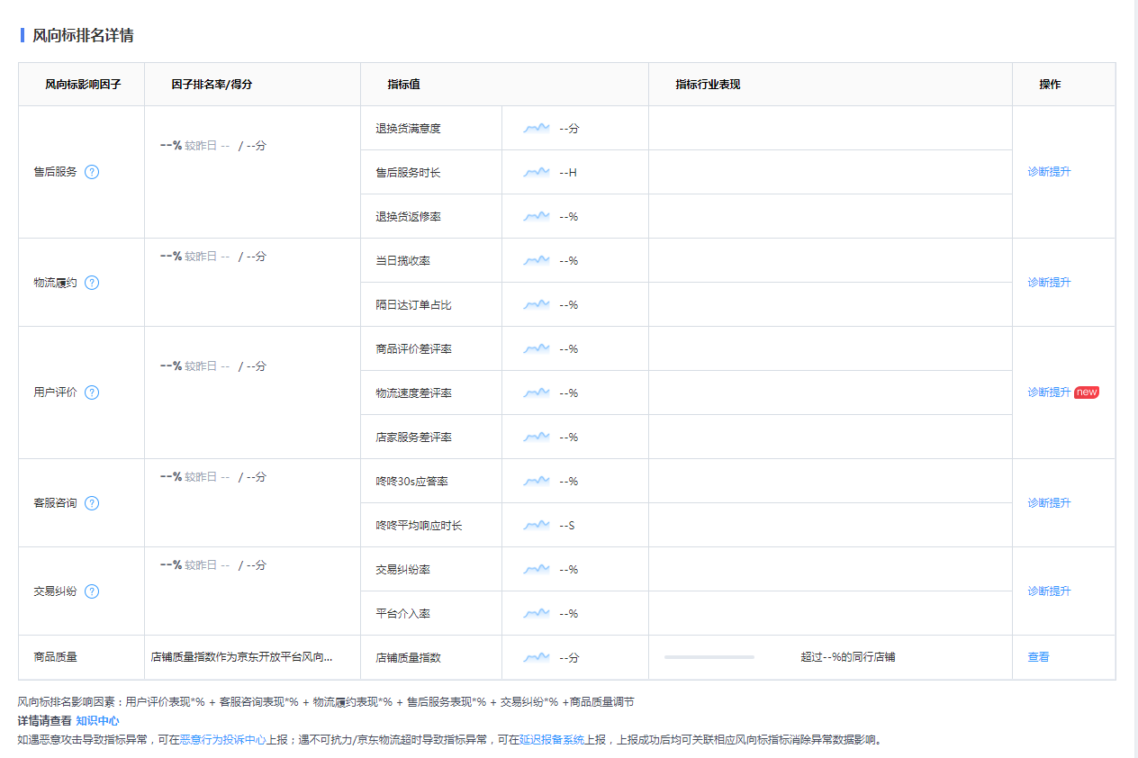 當(dāng)我們點(diǎn)擊風(fēng)向標(biāo)進(jìn)去之后,會(huì)看到(如上圖)這些數(shù)據(jù)。比如風(fēng)向標(biāo)的排名率、店鋪的星級(jí)、風(fēng)向標(biāo)排名率的變化趨勢(shì)以及售后情況等。對(duì)風(fēng)向標(biāo)來(lái)說(shuō),與其說(shuō)他是一個(gè)數(shù)據(jù)顯示板,我更覺(jué)得他是一個(gè)對(duì)于我們店鋪來(lái)錯(cuò)誤的集中地。對(duì)于店鋪的好壞也相當(dāng)于給店鋪?zhàn)隽艘粓?chǎng)考試,而風(fēng)向標(biāo)的分?jǐn)?shù)就覺(jué)決定我們店鋪的健康度,風(fēng)向標(biāo)排名率高低就體現(xiàn)我們的店鋪健康度的參考數(shù)據(jù)。